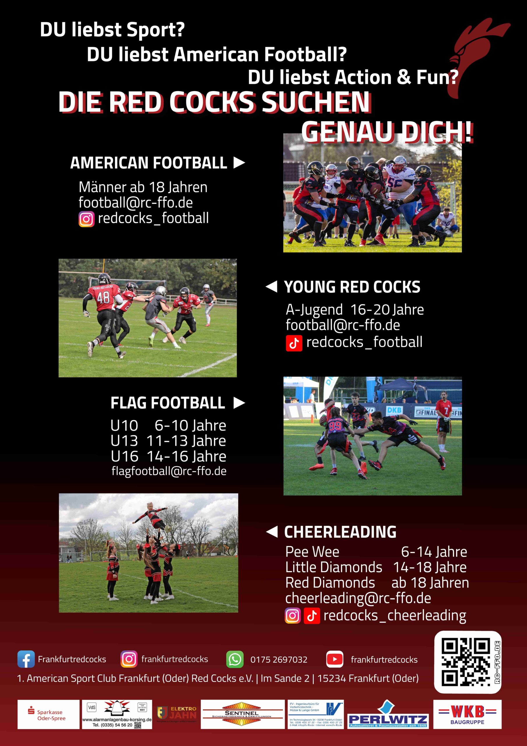 Unsere Sponsoren, insbesondere Elektro Jahn, WKB, Sentinel, die Sparkasse Oder-Spree, das Frankfurter Brauhaus, Familie Gittner, Firma Perlwitz, Loscon und IVF Müller & Lange ermögli-chen mit ihrer Unterstützung unseren Sportbetrieb und ein lebendiges Vereinsleben. Neu an unserer Seite ist Alarmanlagen Korsing. Zusätzlich danken wir dem Autohaus Böhmer für neue Cheerleader-Shirts sowie City-Board24 für die Bewerbung unserer Heimspieltage. Die Red Cocks sagen herzlich Danke an alle Unterstützer im Jahr 2025!