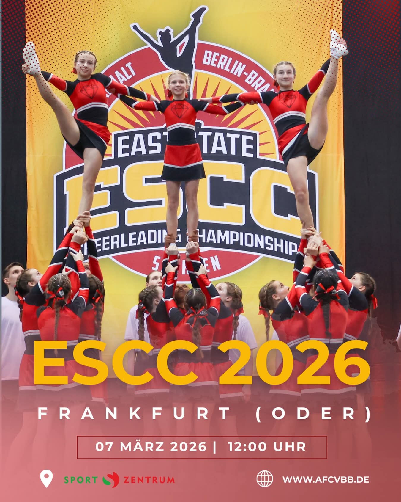 Am 07. März 2026 findet die East State Cheerleading Championship (ESCC) in der Brandenburghalle im Sportzentrum Frankfurt (Oder) statt. Die Landesmeisterschaft bringt über 45 Teams mit rund 500 Cheerleaderinnen und Cheerleadern aus Berlin, Brandenburg, Sachsen und Sachsen-Anhalt zusammen. Die teilnehmenden Teams kämpfen um die Qualifikation zur Deutschen Meisterschaft, die am 30. Mai 2026 in Frankfurt am Main ausgetragen wird. Veranstaltet wird die Meisterschaft von drei Landesverbänden. Zuschauer und Sportbegeisterte sind herzlich eingeladen, die Teams vor Ort zu unterstützen.