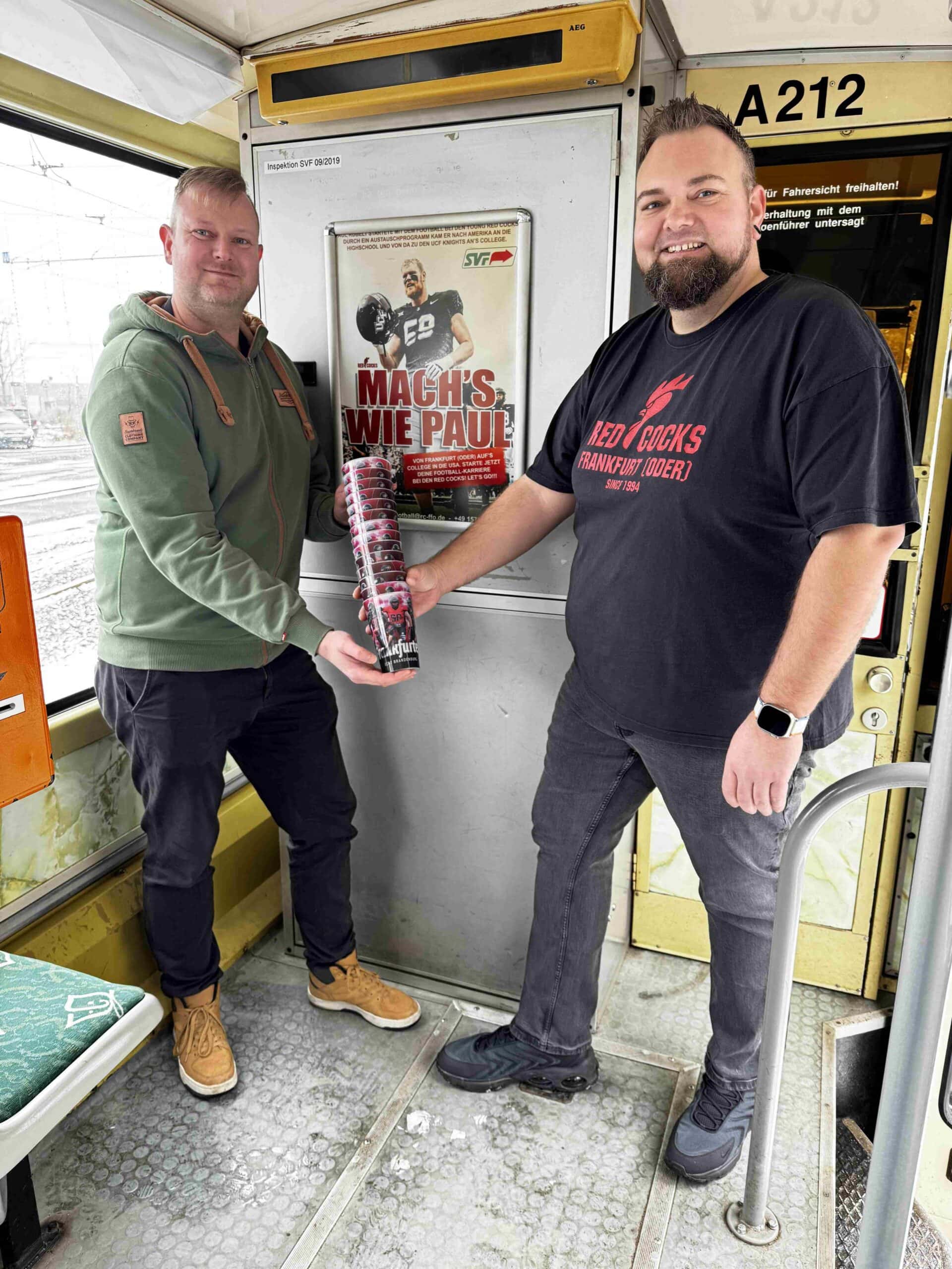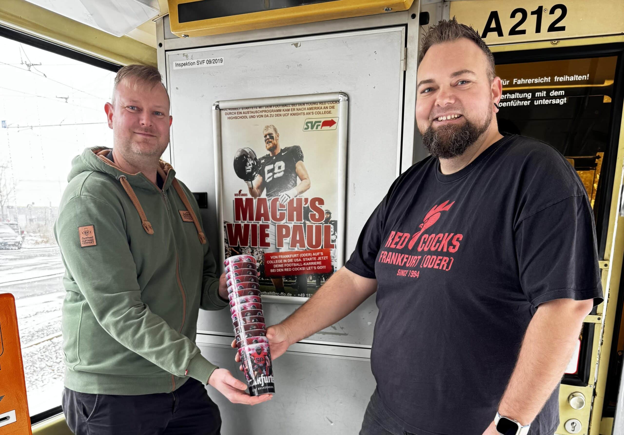 Auf dem Bild hängen Peter Löwe von der SVF und Stefan Mattig-Schüler, Vorstandsmitglied der Red Cocks, das erste Plakat der Aktion „Mach´s wie Paul“ in der Straßenbahn Tatra KT4D (Wagen 212) auf. Gleichzeitig wurden Red Cocks Motiv-Becher übergeben, die bald als Prämie über das Bonusprogramm in der SVF Mobi-App bezogen werden können.