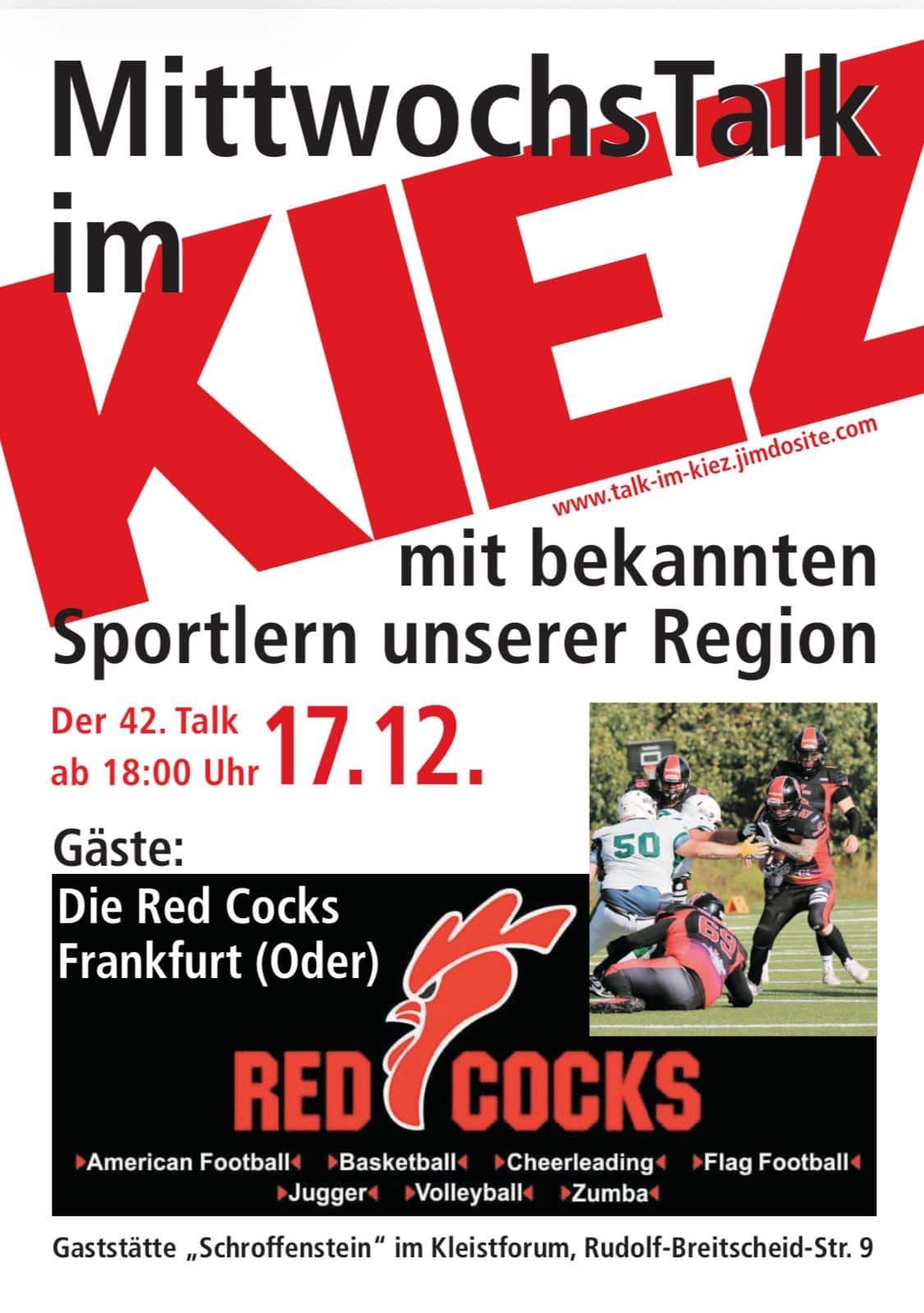 Die Red Cocks sind zu Gast in der beliebten Frankfurter Talkrunde „Mittwochs Talk im Kiez“ mit Moderator Uwe Köppen. Hier werden ehemalige wie aktive Sportler, Trainer und verdienstvolle Funktionäre aus...
